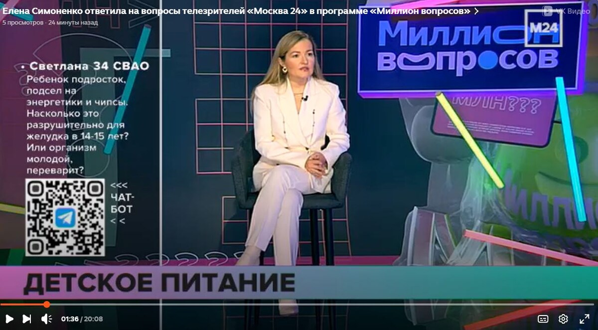 Начальник отдела прогнозирования технологических исследований и инновационного развития НИИ детского питания – филиала ФГБУН «ФИЦ питания и биотехнологии» Елена Симоненко приняла участие в программе «Миллион вопросов» на телеканале «Москва 24». Она дала интервью и ответила на многие вопросы телезрителей, в том числе – вреден ли сахар в детских йогуртах, как правильно вводить прикорм, безопасны ли пюре в баночках и другие. Более подробная информация представлена в видео https://dzen.ru/video/watch/694522799627b867a877f097